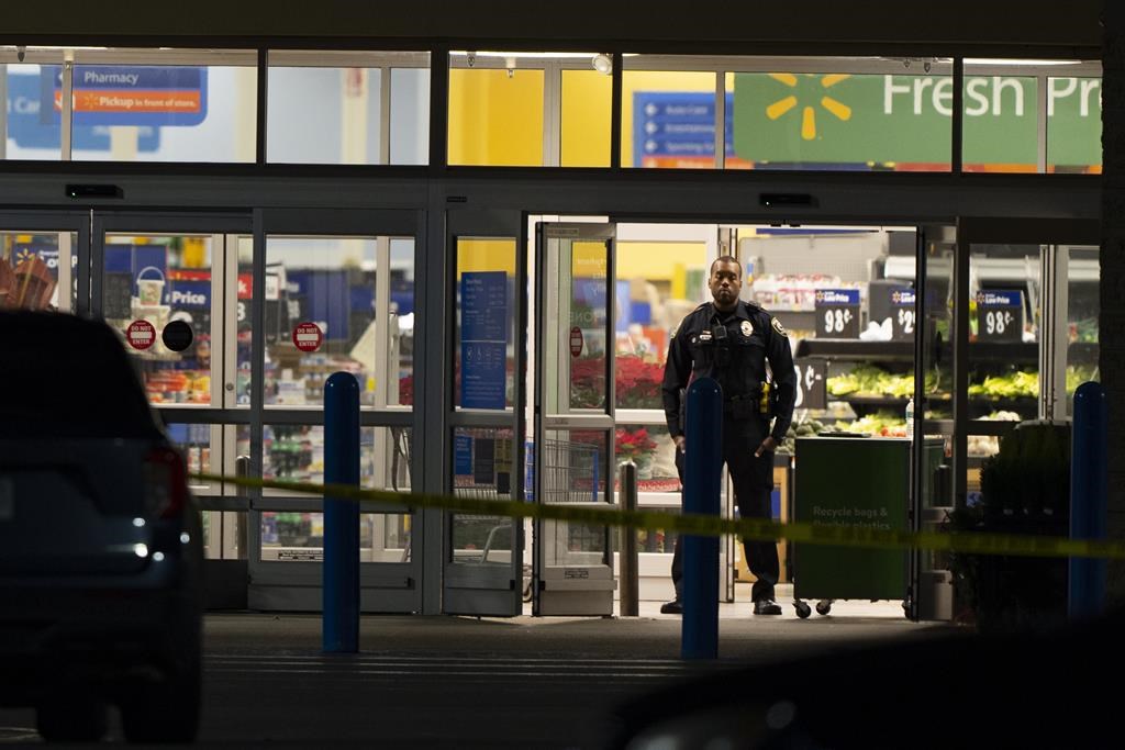 [Image: Exterior view of the Walmart where the shooting occurred, with police presence]
